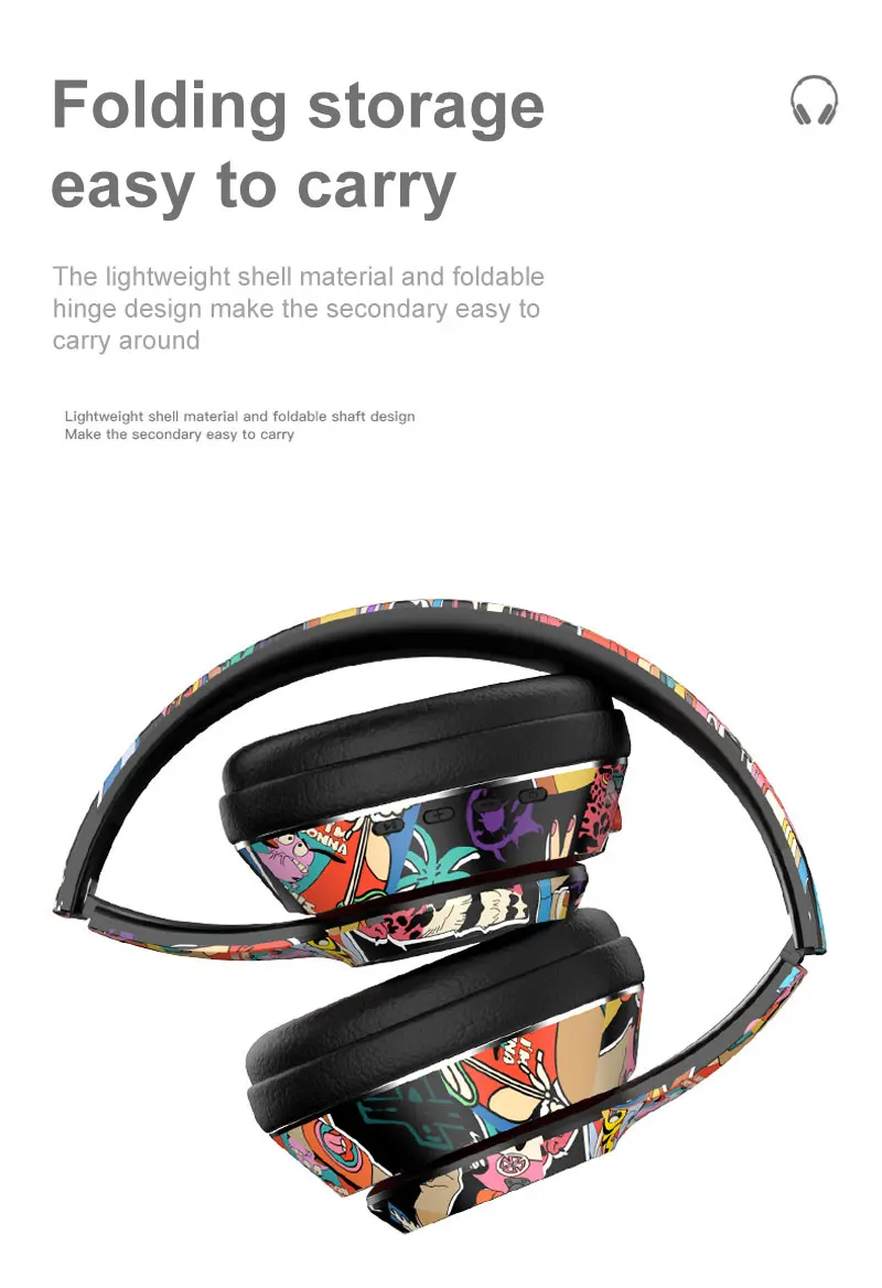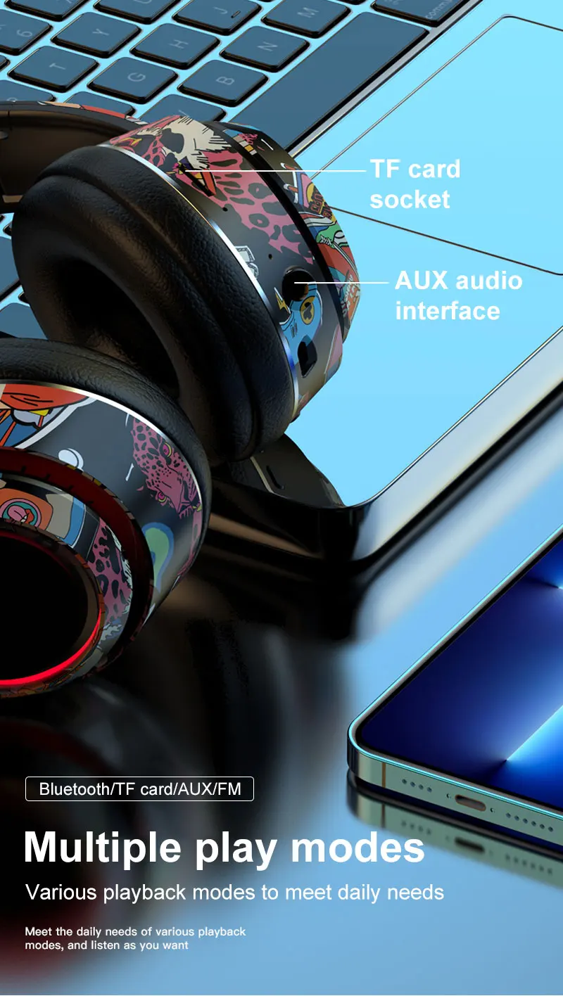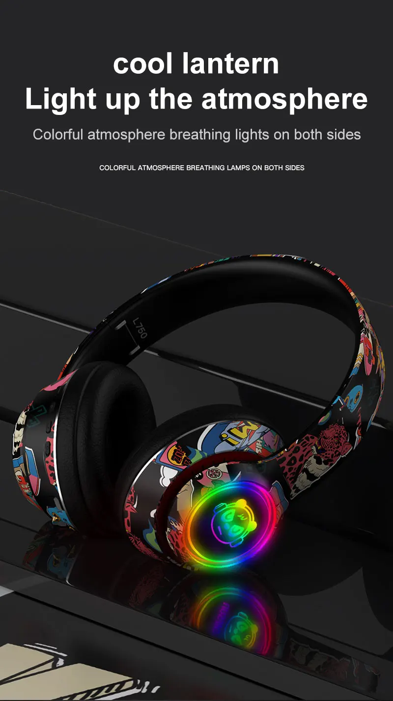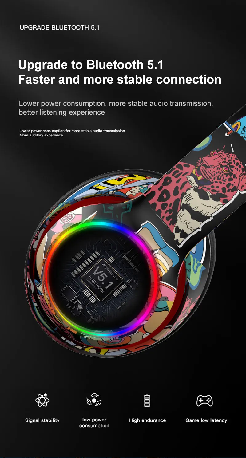 Graffiti Bluetooth 5.1 Gaming Headset Wireless DJ Headphones Mic, RGB Lights TF Card Support"